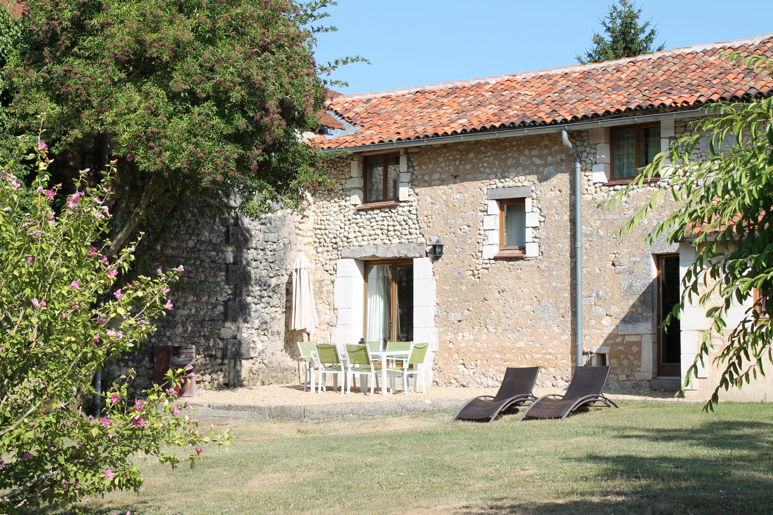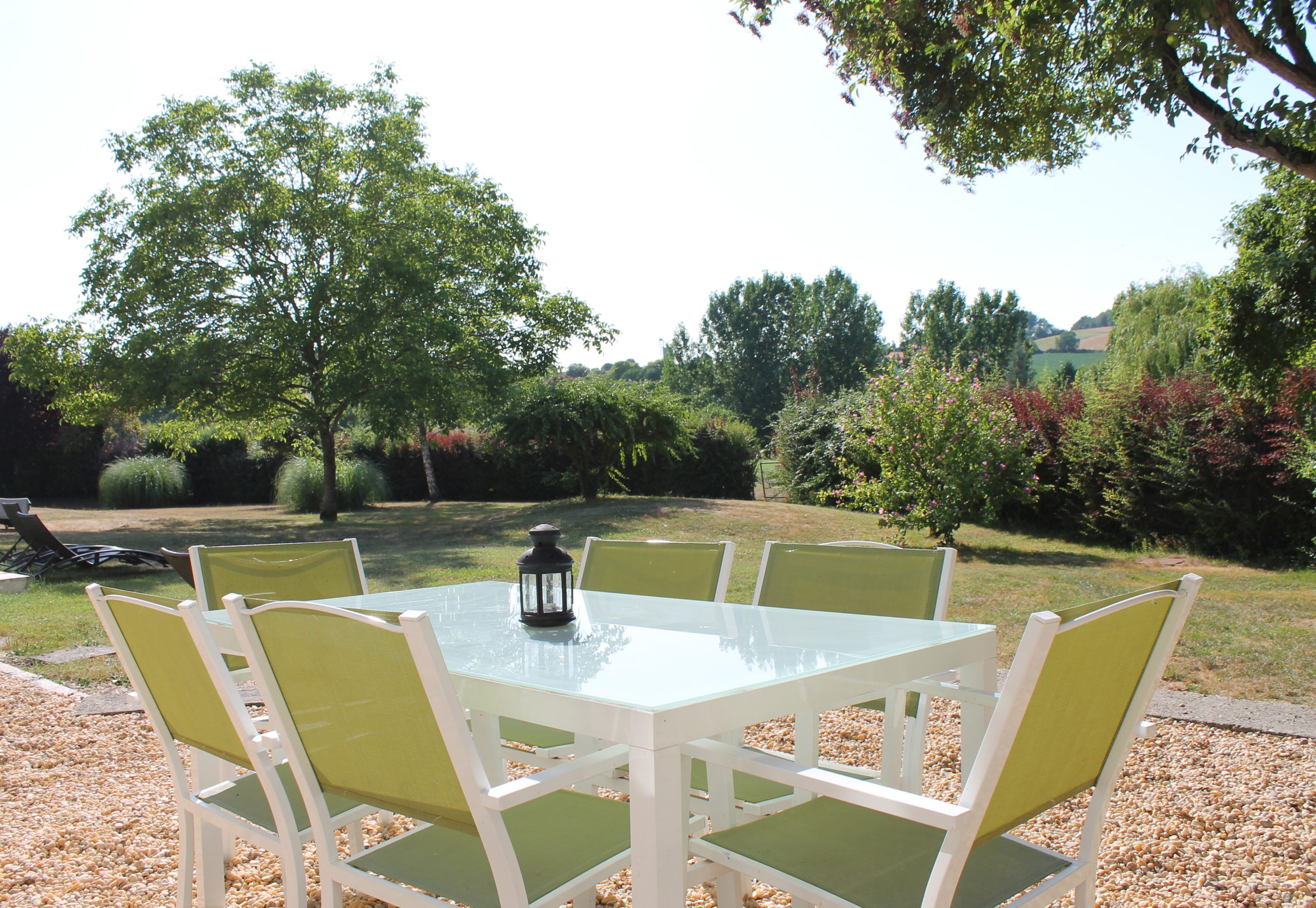 Le jardin est meublé de chaises longues, d'une salle à manger et d'un barbecue, le tout sur fond de campagne sereine.